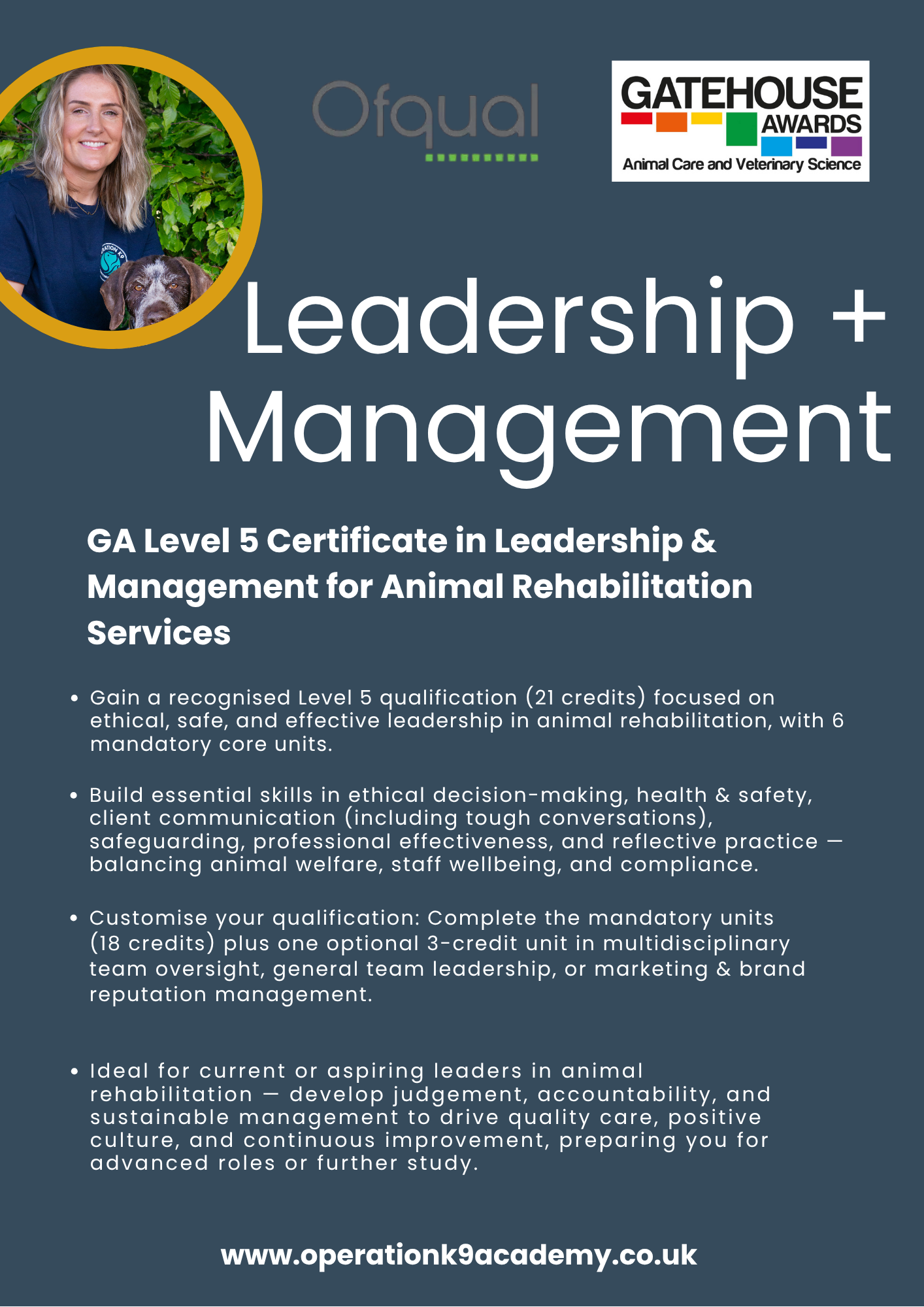 Graduates will be equipped to lead animal rehabilitation services effectively, support continuous improvement, and contribute to a positive organisational culture and service sustainability.